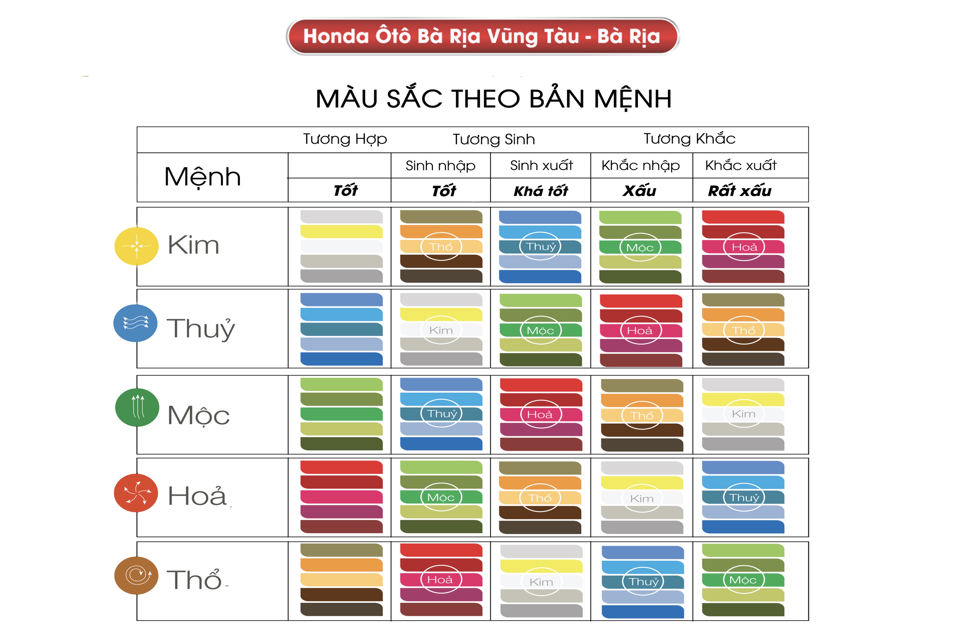 Ngoài ra, từng thành tố trong ngũ hành đều tương ứng với màu sắc riêng biệt. Trong đó, tương ứng với mệnh Thủy là màu xanh nước biển, xanh da trời, đen; mệnh Mộc tương ứng với màu xanh lá cây; mệnh Hỏa có màu đỏ, hồng, da cam; mệnh Thổ có màu nâu, vàng đậm và mệnh Kim có màu bạc, trắng, xám, ghi.