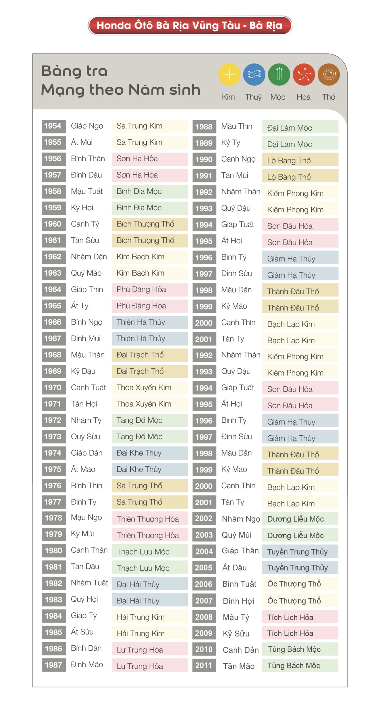 Trước khi có thể chọn được một chiếc ô tô có màu sắc hợp với mệnh để tạo ra phong thủy xe hơi tốt, chủ xe cần biết rõ năm sinh của mình ứng với cung mệnh nào trong ngũ hành.