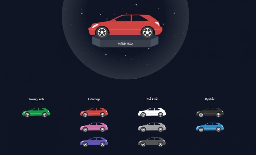 - Người mệnh Hỏa không nên chọn ô tô có màu xanh nước biển, đen (Thủy) và trắng, ánh kim, bạc, ghi xám (Kim).