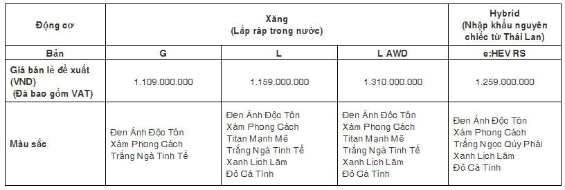 Honda CR-V thế hệ thứ 6 hoàn toàn mới chính thức bán tại thị trường Việt Nam từ ngày 29 tháng 10 năm 2023 qua hệ thống các Nhà Phân phối Ôtô Honda trên toàn quốc với bao gồm 2 tùy chọn động cơ: động cơ xăng (Lắp ráp trong nước) và động cơ Hybrid (Nhập khẩu nguyên chiếc từ Thái Lan) với các phiên bản cùng tùy chọn màu sắc và mức giá bán lẻ đề xuất như sau: