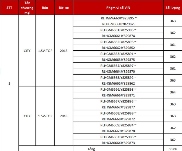 Hà Nội, ngày 16 tháng 6 năm 2020 - Công ty Honda Việt Nam (HVN) thông báo triệu hồi các kiểu loại xe Honda CITY do HVN sản xuất, lắp ráp và Honda JAZZ, Honda HR-V, Honda CIVIC, Honda CR-V, Honda ACCORD do HVN nhập khẩu để thay thế bơm nhiên liệu. Theo đó, HVN triển khai chiến dịch triệu hồi để kiểm tra và thay thế bơm nhiên liệu mới cho các loại xe trên kể từ ngày 16 tháng 6 năm 2020.