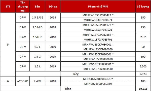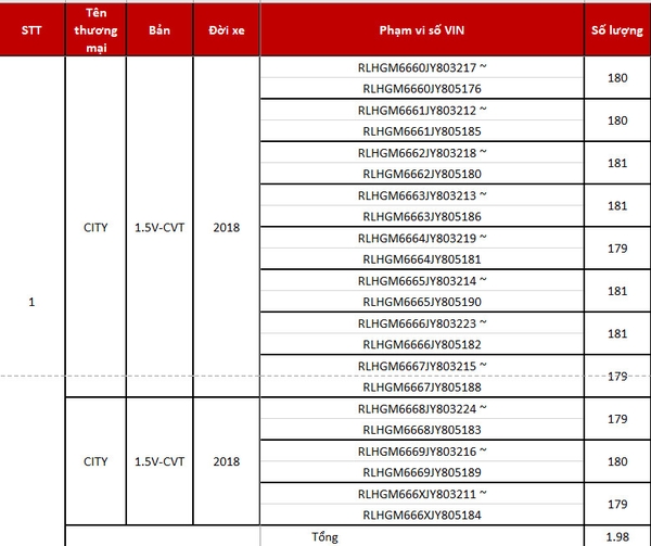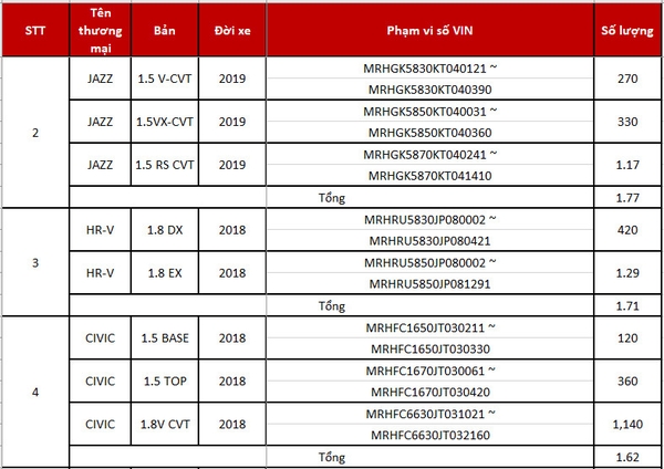 Mẫu xe liên quan đến đợt triệu hồi này như sau: