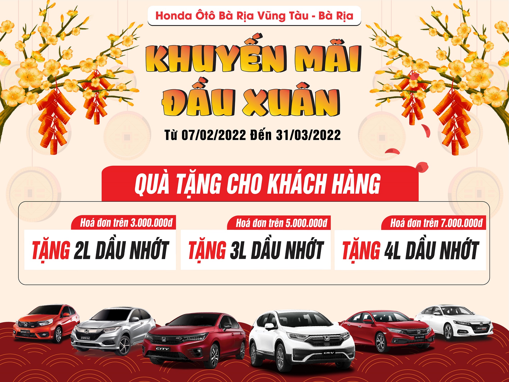 Nhân dịp đầu xuân năm mới, Honda Ôtô Bà Rịa Vũng Tàu - Bà Rịa triển khai chương trình "KHUYẾN MÃI ĐẦU XUÂN" áp dụng cho Khách hàng đến Đại lý sử dụng Dịch vụ bảo dưỡng & các gói Dịch vụ cộng thêm phát sinh chi phí thanh toán.