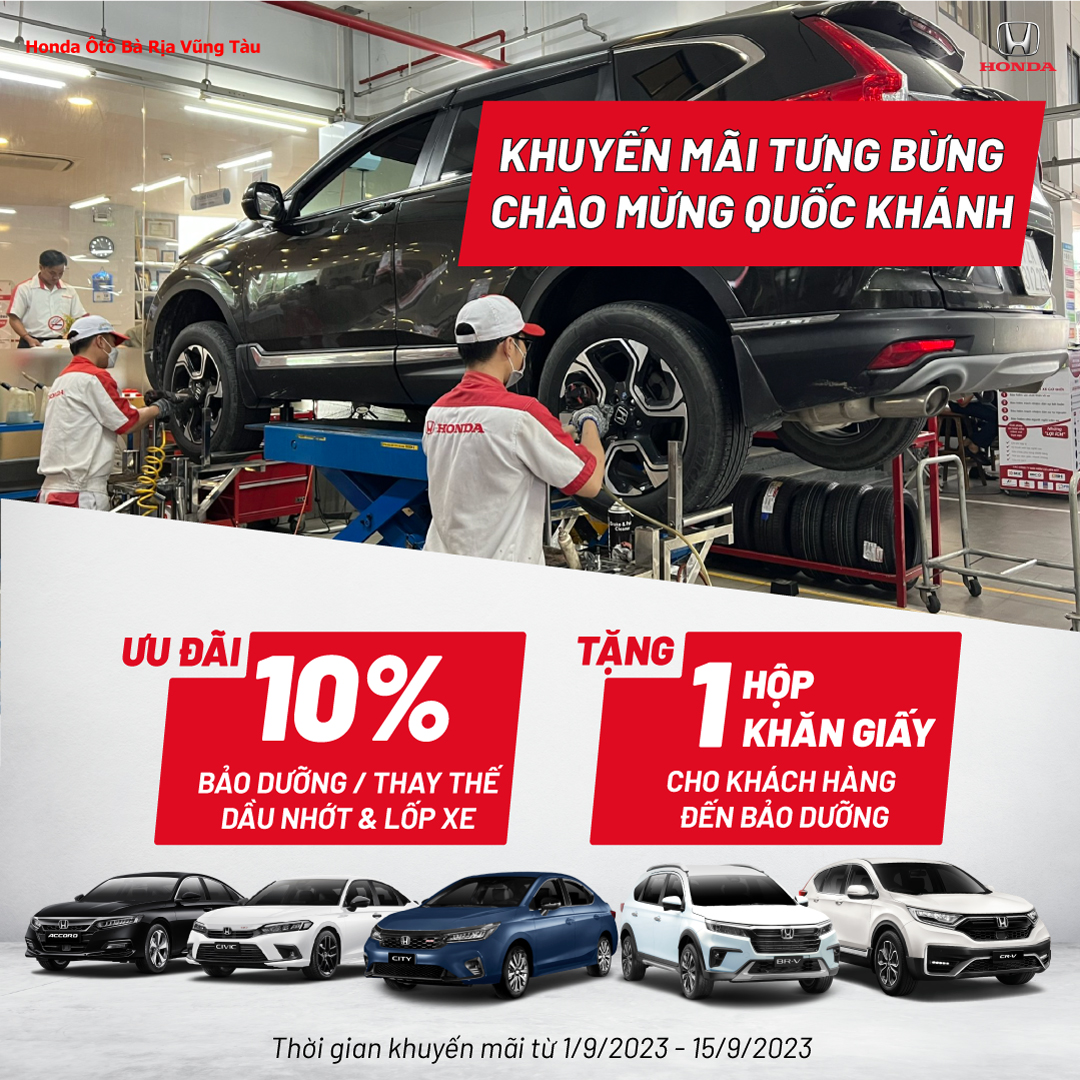 Nhân ngày Quốc Khánh 2/9, Honda Ô tô Bà Rịa Vũng Tàu gửi đến quý khách hàng chương trình khuyến mại dịch vụ như sau: