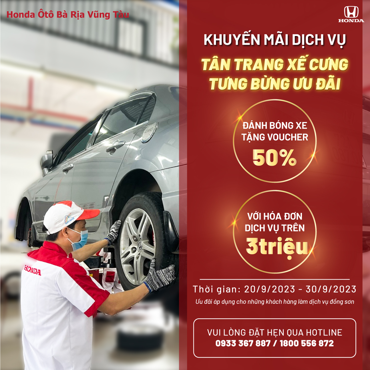 Từ ngày 20/9 - 30/9/2023, khi tân trang lại xế yêu tại Honda Ôtô Bà Rịa Vũng Tàu, khách hàng sẽ nhận ngay ưu đãi hấp dẫn: