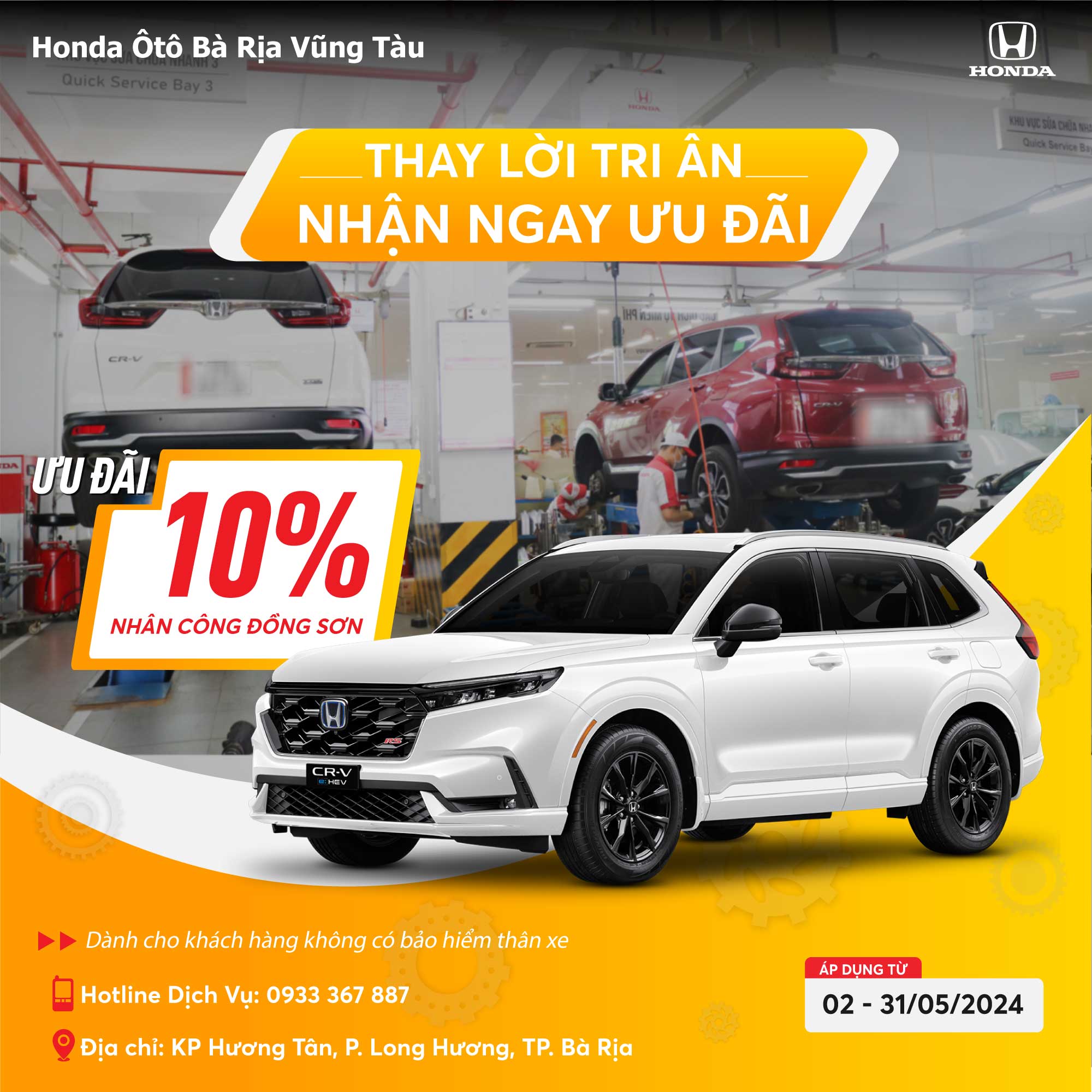Thay lời tri ân quý khách hàng đã và đang đồng hành cùng Honda Ôtô Bà Rịa Vũng Tàu, chúng tôi gửi đến quý khách hàng gói ưu đãi dịch vụ đặc biệt trong tháng 5 này.