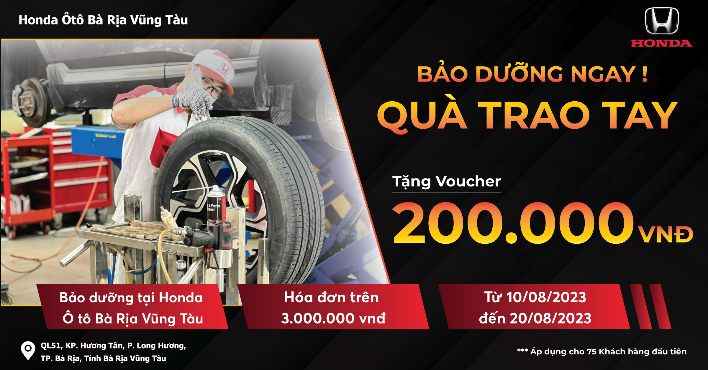 Khi đến làm bảo dưỡng tại Honda Ôtô Bà Rịa Vũng Tàu với hoá đơn từ 3.000.000 VNĐ trở lên, Quý khách sẽ có cơ hội nhận voucher trị giá 200.000 VNĐ qua app My Honda+.