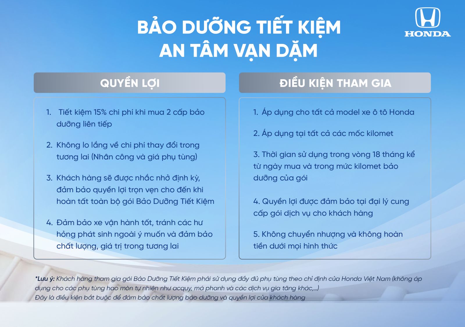 - KH tham gia gói BDTK phải sử dụng đầy đủ phụ tùng theo chỉ định của HVN (không áp dụng cho các phụ tùng hao mòn tự nhiên như acquy, má phanh và các dịch vụ gia tăng khác,…)