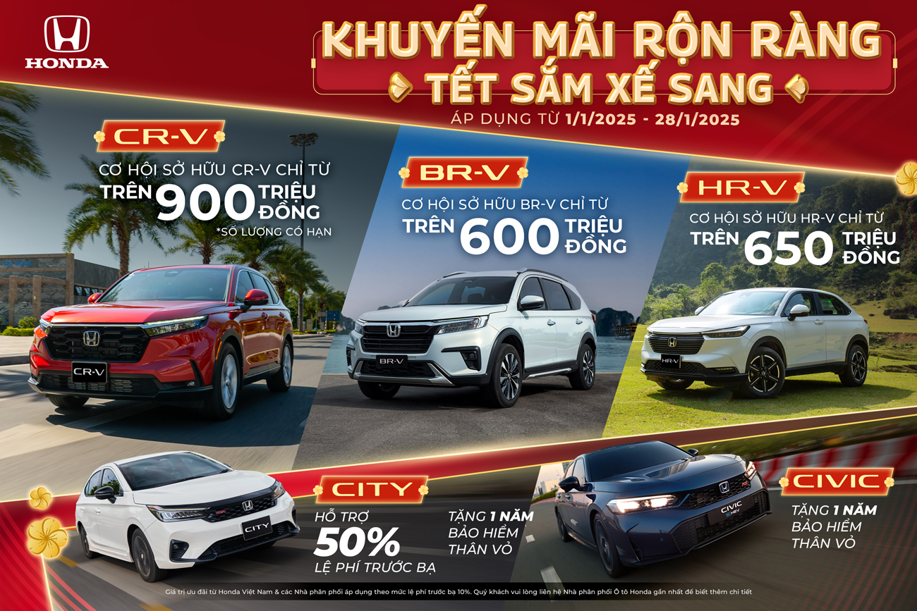 Tưng bừng chào đón mùa lễ hội cuối năm, với mong muốn mang đến nhiều hơn nữa cơ hội trải nghiệm các mẫu xe ô tô Honda và tận hưởng những khoảnh khắc du ngoạn tuyệt vời cho Khách hàng, Honda Việt Nam phối hợp cùng hệ thống Nhà Phân phối triển khai chương trình khuyến mại hấp dẫn từ ngày 01/01//2025 đến hết ngày 28/01/2025 cho các dòng xe: Honda CR-V, Honda BR-V, Honda HR-V, Honda City, Honda Civic Honda Accord.