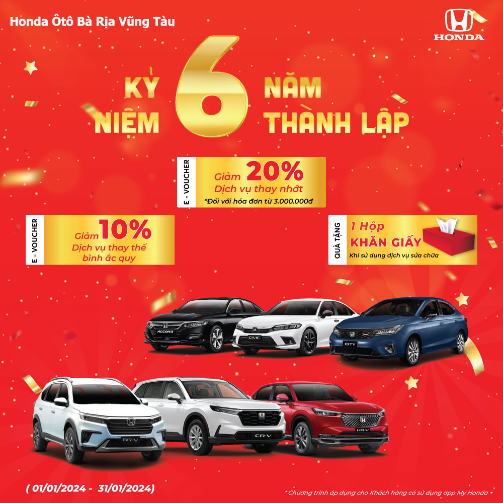 Nhằm kỷ niệm 6 năm thành lập và thay lời tri ân đến sự đồng hành của quý khách hàng trong thời gian vừa qua, Honda Ôtô Bà Rịa Vũng Tàu gửi đến quý khách hàng chương trình ưu đãi dịch vụ hấp dẫn từ 𝟎𝟏/𝟎𝟏/𝟐𝟎𝟐𝟒 – 𝟑𝟏/𝟎𝟏/𝟐𝟎𝟐𝟒: