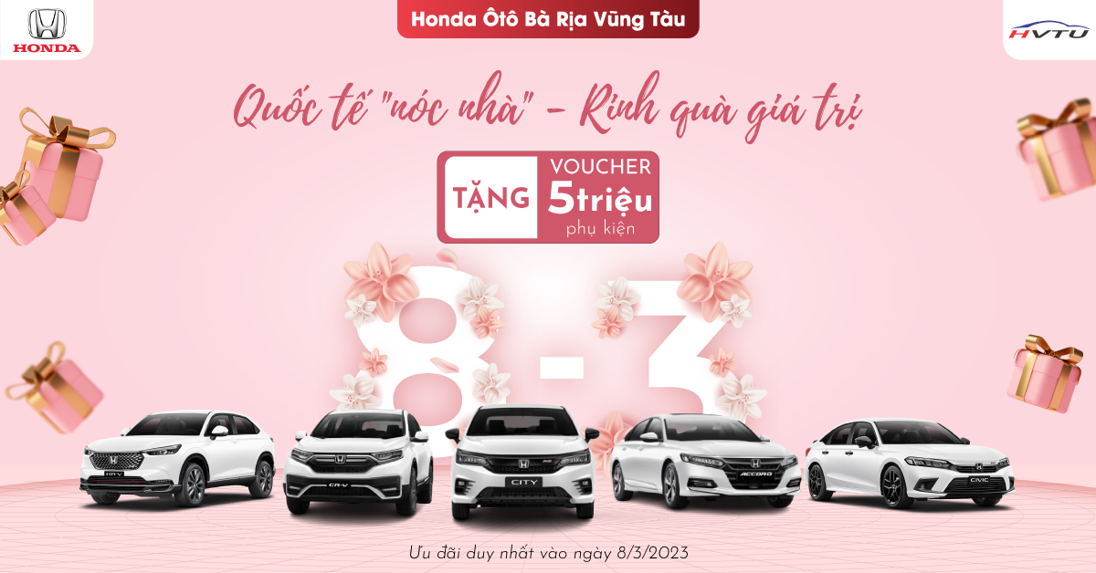- Tặng ngay Voucher 5.000.000 VNĐ phụ kiện chính hãng cho khách hàng mua & ký hợp đồng một trong các dòng xe như: Honda CR-V, Honda City, Honda Civic, Honda Accord, duy nhất trong ngày 8/3/2023.