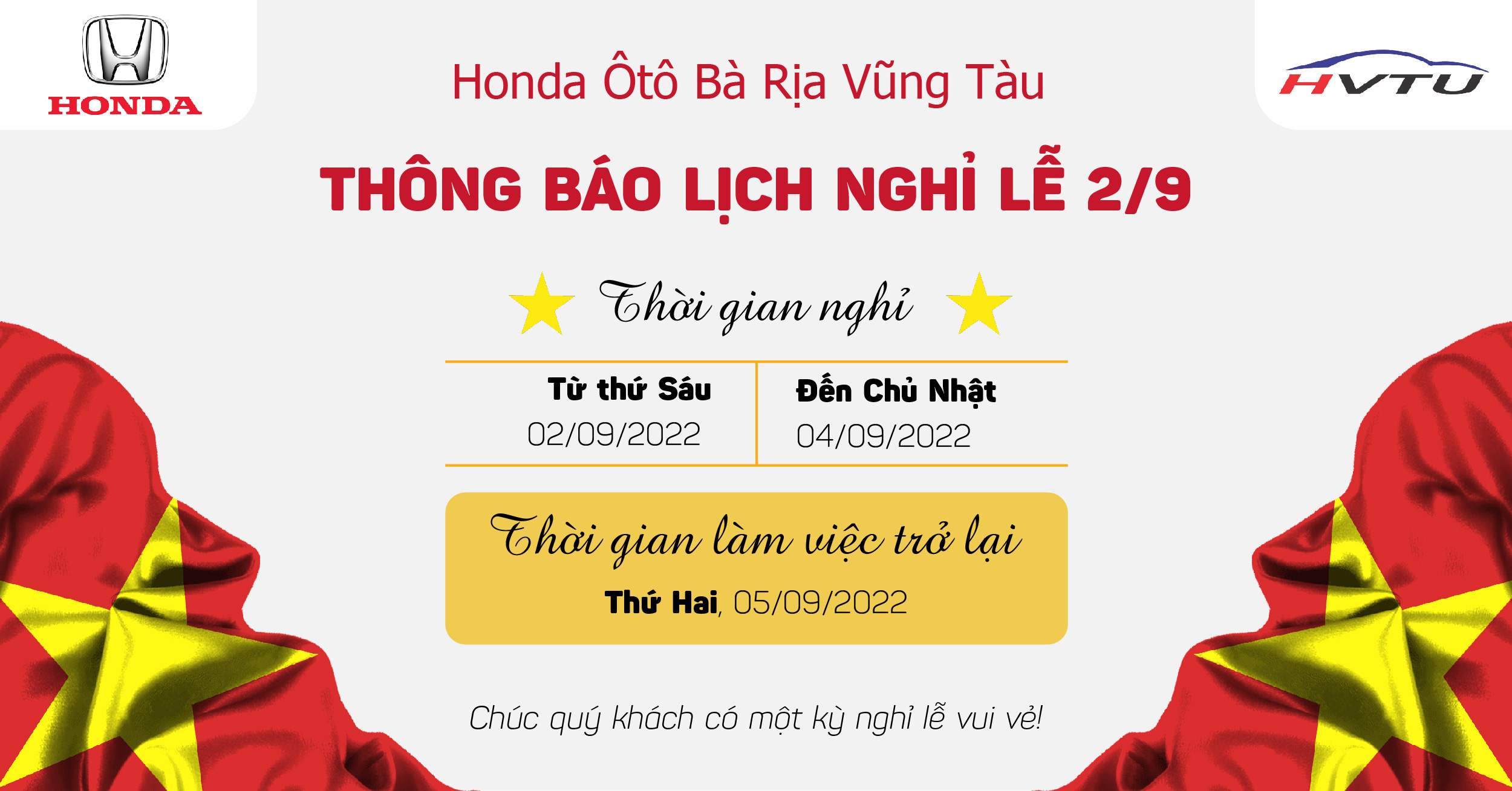 Honda Ôtô Bà Rịa Vũng Tàu xin thông báo đến Quý khách hàng lịch nghỉ lễ 2/9 của Công ty như sau: