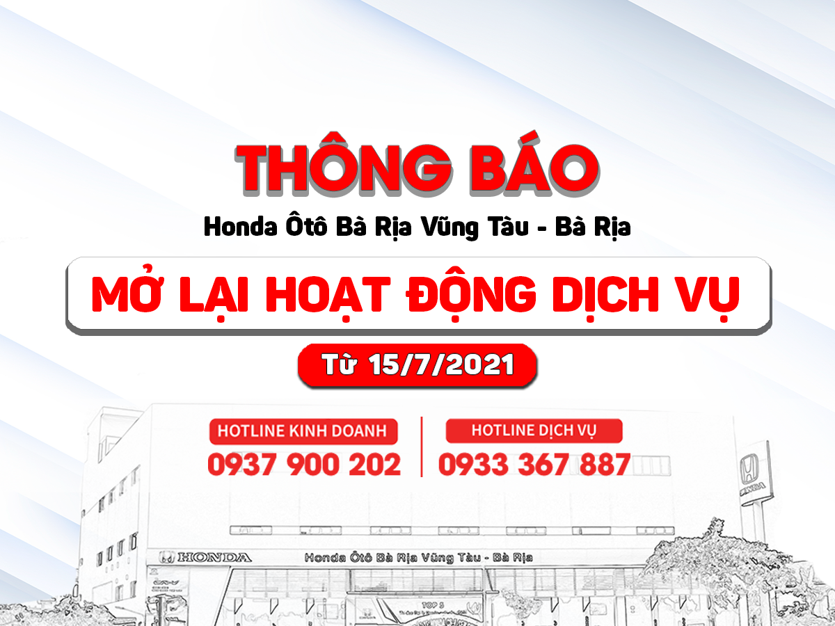 Để bảo nhu cầu bảo dưỡng và chăm sóc ô tô cho quý khách hàng. Honda Ôtô Bà Rịa Vũng Tàu - Bà Rịa xin được thông báo rộng rãi đến quý khách việc mở lại hoạt động dịch vụ từ 15/07/2021.