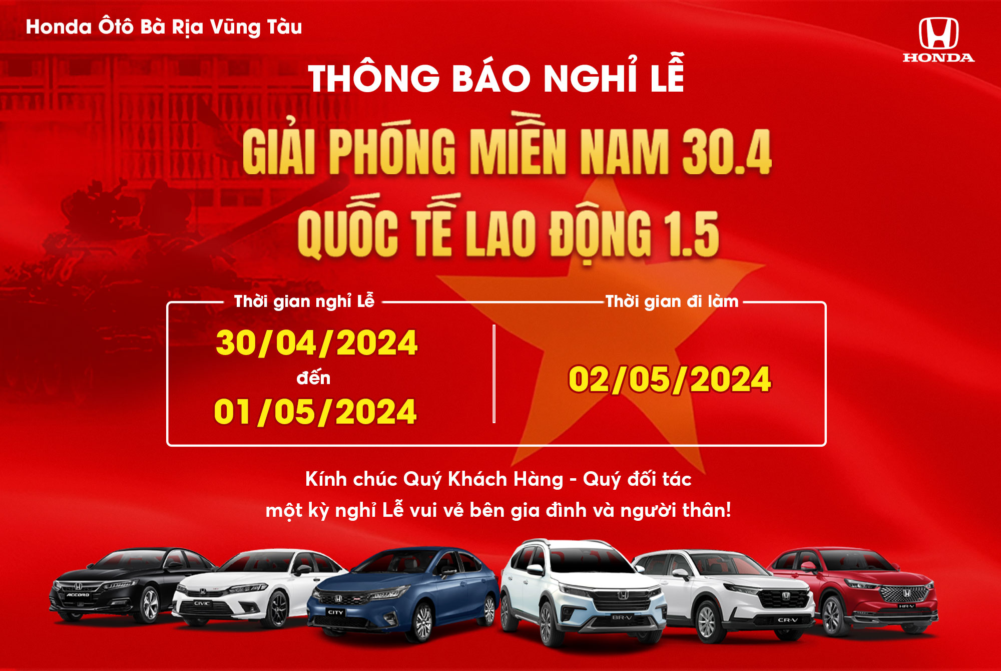 Chào mừng kỷ niệm ngày Giải phóng miền Nam 30.4 và ngày Quốc tế lao động 1.5, Honda Ôtô Bà Rịa Vũng Tàu gửi đến Quý khách hàng, Quý đối tác lịch nghỉ Lễ như sau