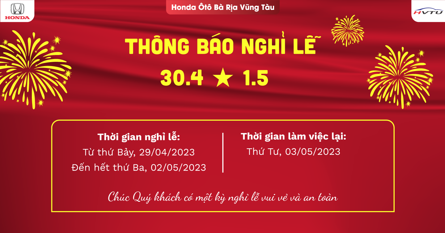 Honda Ôtô Bà Rịa Vũng Tàu xin trân trọng thông báo đến Quý khách hàng và Quý đối tác lịch nghỉ lễ 30/4 và 1/5 như sau: