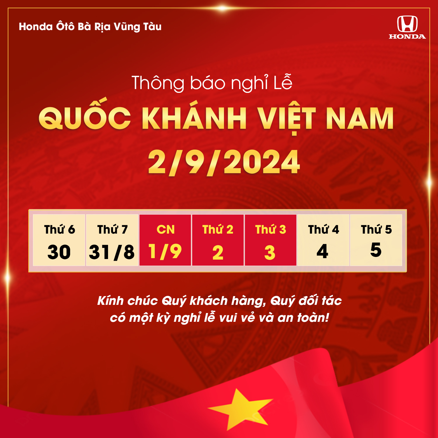 Hòa chung không khí mừng ngày Quốc Khánh Việt Nam 2/9, Honda Ôtô Bà Rịa Vũng Tàu trân trọng thông báo lịch nghỉ lễ của CBNV như sau: