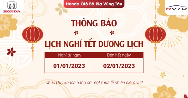 Honda Ôtô Bà Rịa Vũng Tàu thông báo đến Quý khách hàng và Quý đối tác về thời gian nghỉ Tết dương lịch như sau: