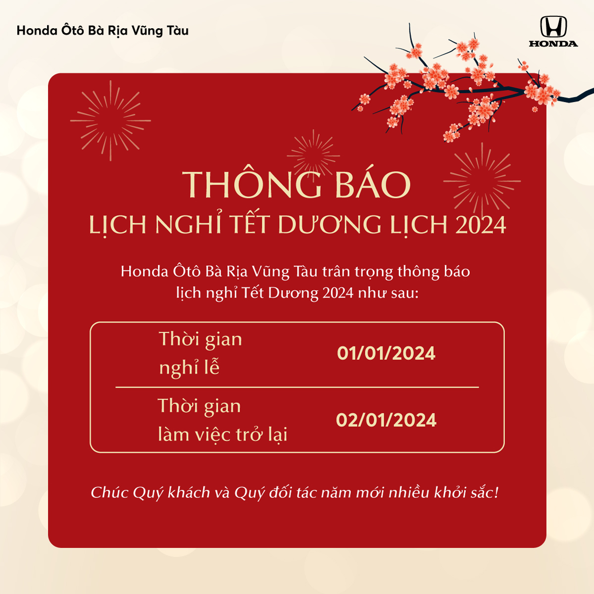 Honda Ôtô Bà Rịa Vũng Tàu thông báo đến Quý khách hàng và Quý đối tác về thời gian nghỉ Tết dương lịch 2024 như sau: