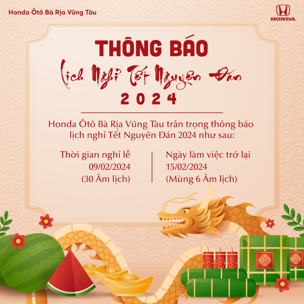 Honda Ôtô Bà Rịa Vũng Tàu trân trọng thông báo đến Quý Khách hàng, Đối tác lịch nghỉ Tết Nguyên Đán Giáp Thìn 2024 như sau: