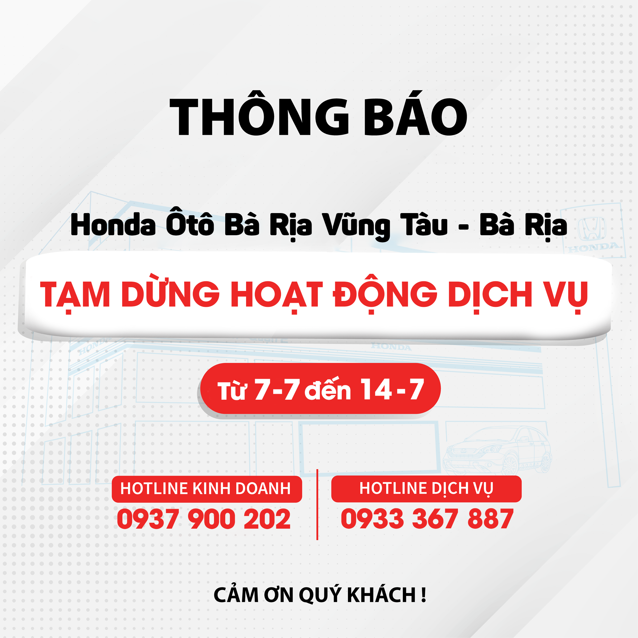 Để bảo vệ sự an toàn cho khách hàng và nhân viên công ty trước diễn biến phức tạp của dịch Covid-19, đồng thời góp phần chung tay đẩy lùi dịch bệnh. Honda Ôtô Bà Rịa Vũng Tàu xin thông báo tạm dừng hoạt động dịch vụ từ 07/07/2021 đến 14/07/2021. Thời gian làm việc trở lại sẽ thông báo theo tình hình diễn biến của dịch bệnh.