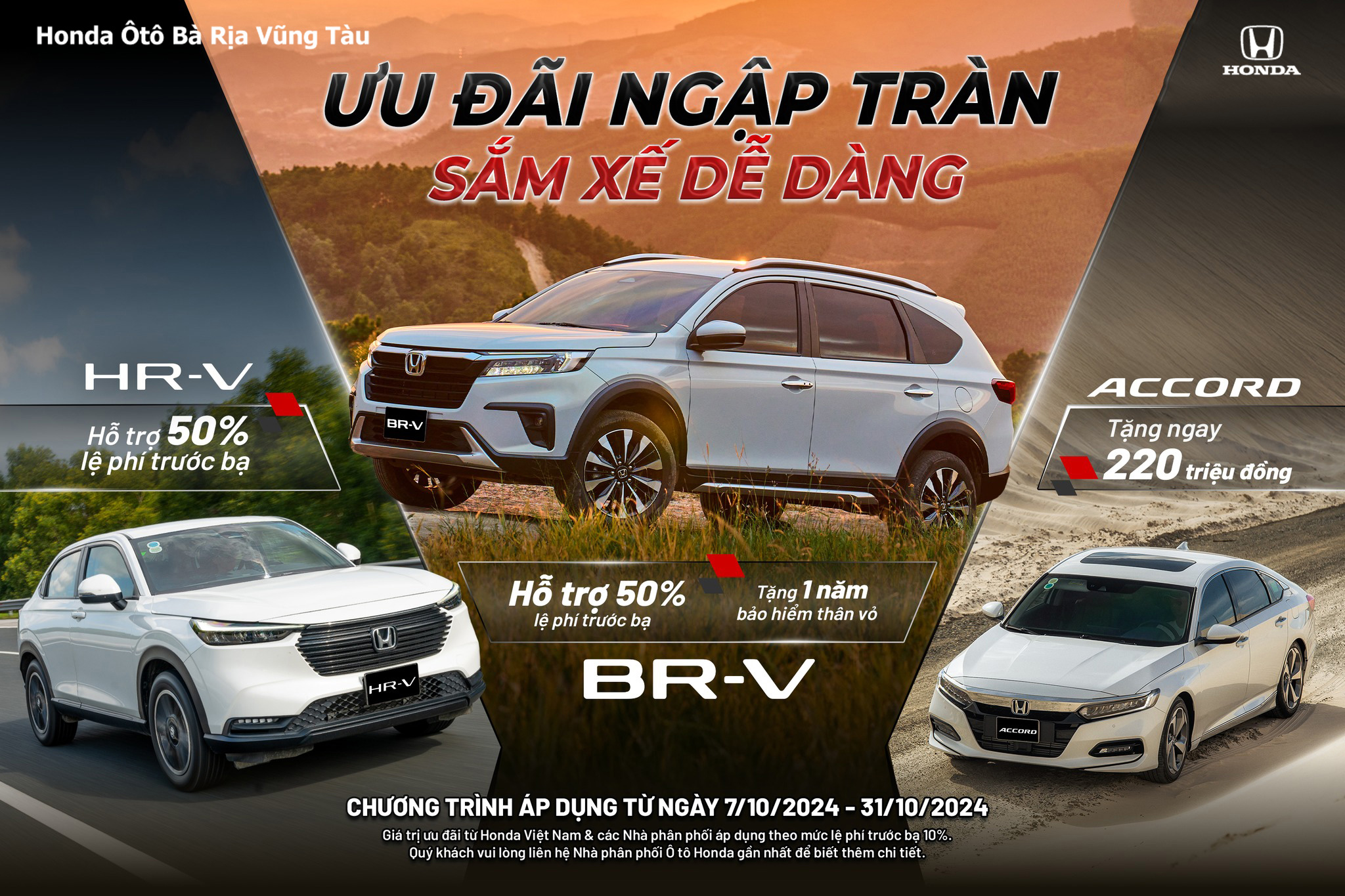 Với mong muốn mang đến cho khách hàng nhiều hơn nữa cơ hội trải nghiệm các mẫu xe ô tô nhập khẩu của Honda và tận hưởng những khoảnh khắc trọn vẹn bên gia đình, Honda Việt Nam phối hợp cùng hệ thống Nhà Phân phối triển khai chương trình khuyến mại hấp dẫn từ ngày 07 đến hết ngày 31 tháng 10 năm 2024 dành cho các dòng xe Honda BR-V, Honda HR-V, Honda Accord: